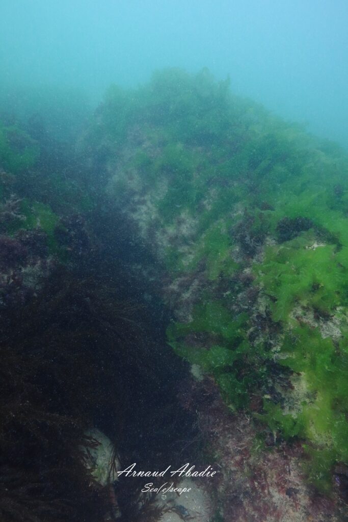 Les roches nous révèlent leur chevelure algale multicolore dans toute sa dimension verticale. Leur agencement prend une nouvelle signification par rapport à leur étalement à marée basse. La structuration en trois dimensions du paysage sous-marin formé par la végétation influe fortement la répartition et la circulation des espèces. Que ce soit les poissons dans le ciel aqueux ou les laborieux organismes benthiques qui marchent ou rampent sur le socle rocheux. Cette fronde d’algue prend alors l’apparence d’une forêt tortueuse et complexe à l’échelle de ses habitants.