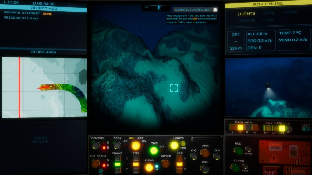 L’exploration des fonds commence alors. L’interface du jeu est très immersive avec de nombreux panneaux et moniteurs de contrôle (position du navire et carte de la bathymétrie, caméra du ROV, commandes, sonar). Cela est très proche de la réalité. D’ailleurs, tout ce que vous verrez lors de vos explorations virtuelles existe bel et bien. Que ce soit le relief du fond, les phénomènes physiques et chimique, la biodiversité et les épaves. Le jeu se découpe en missions sur toute la surface de l’océan mondial avec des objectifs de recherche et d’observation divers. Il est important d’avoir à l’esprit que le jeu simplifie fortement le principe de l’exploration des grands fonds qui dans la réalité mobilise des équipages de plusieurs dizaines de personnes, demande des mois voire des années de préparation, durent plusieurs semaines voire plusieurs mois, et coûte des millions d’euros.