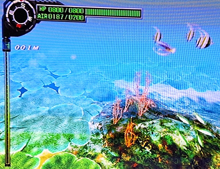 Si les grandes profondeurs vous terrifient mais que la plongée en scaphandre vous passionne alors j’ai le jeu, ou plutôt la série de jeux idéale pour vous : les jeux subaquatiques du studio japonais Arika. Leurs premiers essais dans ce domaine au début des années 2000 donnent les deux épisodes de la série Everblue sur PlayStation 2 : Everblue (2001) et Everblue 2 (2002). Dans les deux épisodes vous incarnez Léo, un plongeur qui cherche des trésors dans des épaves des mers tropicales. C’est dans ce cadre que notre protagoniste côtoie la biodiversité marine des récifs coralliens. Poissons, requins, coraux, tortues, dauphins. Le bestiaire est plutôt complet et bien modélisé pour le 3D encore jeune au début des années 2000, de même que les fonds coralliens bigarés. La vue à la première personne (à travers les yeux du personnage) rend les explorations subaquatiques très immersives.